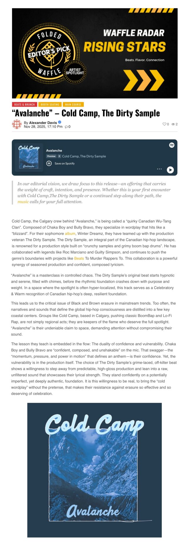 The first single from Calgary crew Cold Camp’s upcoming sophomore album, Winter Dreamz, moves with weight and clarity in a steady build that crashes down with purpose. The Dirty Sample’s chime-filled beat for “Avalanche” feels hypnotic, almost serene, until the rhythm hits and everything shifts. His remix switches out his original production for a gritty, off-kilter NYC gutter beat. On the mic, Chaka Boy and Bully Bravo are confident, composed, and unshakable. This Cold Camp anthem highlights momentum, pressure, and power in motion.