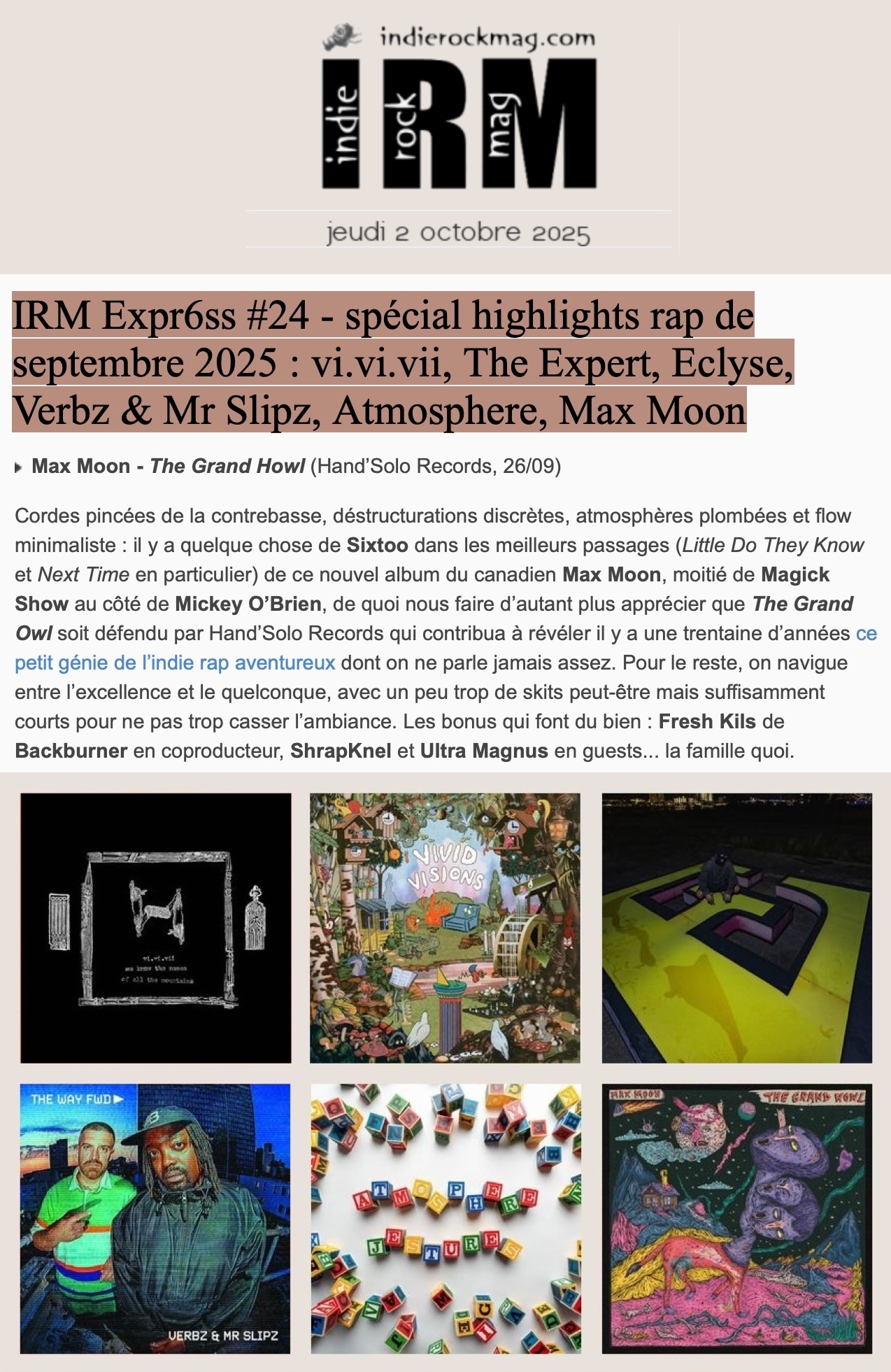 Plucked strings of the double bass, discreet deconstructions, weighty atmospheres and minimalist flow: there is something of Sixtoo in the best passages (Little Do They Know and Next Time in particular) of this new album by the Canadian Max Moon, one half of Magick Show alongside Mickey O'Brien, enough to make us appreciate all the more that The Grand Owl is supported by Hand'Solo Records which helped to reveal thirty years ago this little genius of adventurous indie rap that we never talk about enough. For the rest, we navigate between excellence and ordinary, with a little too many skits perhaps but short enough not to break the atmosphere too much. The bonuses that do feel good: Fresh Kils of Backburner as co-producer, ShrapKnel and Ultra Magnus as guests... family in short.