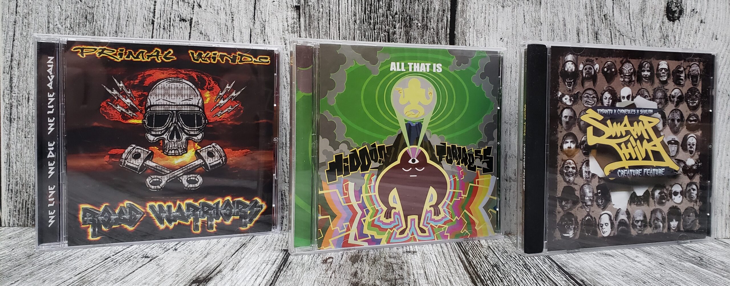 The best deal is the CD bundle of three CDs for the low price of $6.66. With this bundle, get All That Is, the last album from Vancouver rap duo Hidden Fortress; Creature Feature, the debut album in the successful b-movie rap franchise that is the rap trio of Swamp Thing; and Road Warriors, the post-apocalyptic, zombie-infested wasteland envisioned by nedcore duo Primal Winds.