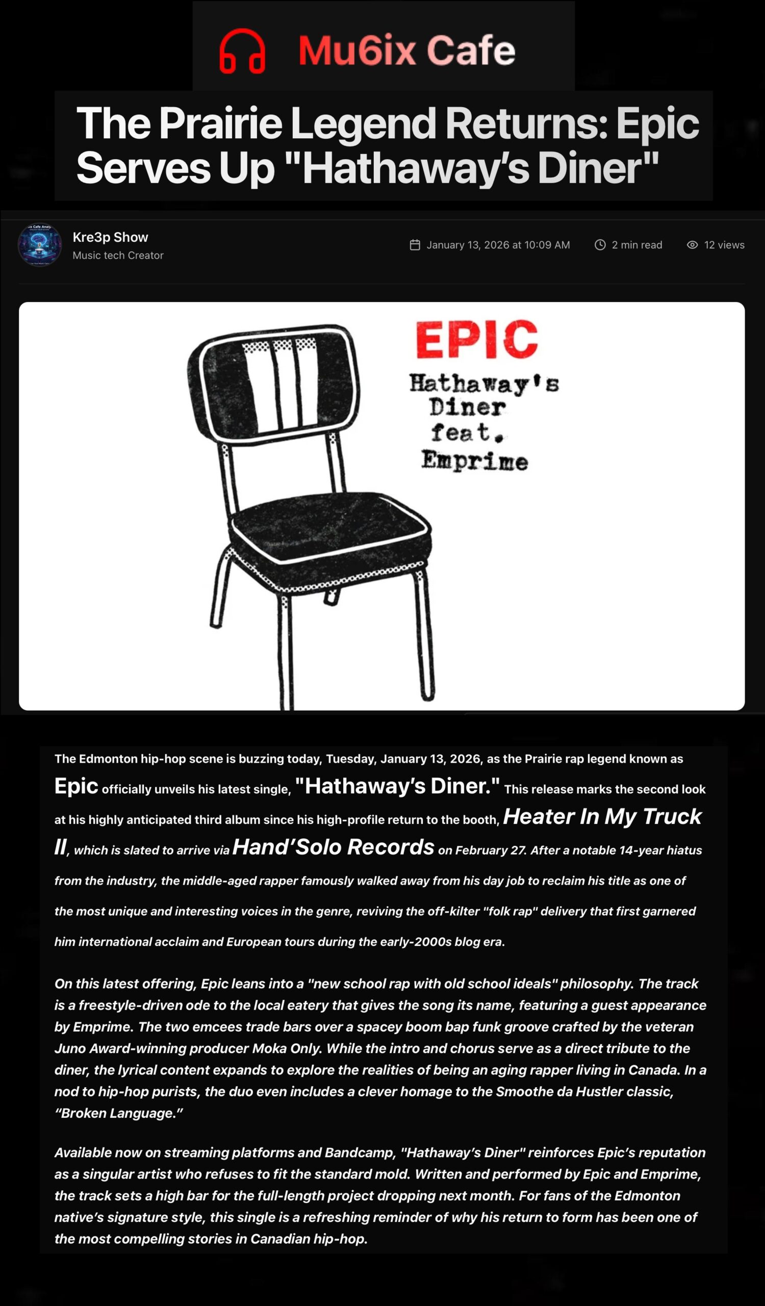 On this freestyle track that also serves as the second single to Heater In My Truck II, his upcoming new album dropping February 27, 2026 on Hand’Solo Records, Prairie rap legend Epic is joined by Emprime for this ode to local eatery Hathaway’s Diner over a spacey boom bap funk groove courtesy of Juno Award winner Moka Only. While the intro and chorus name drops the diner, Epic and Prime also touch on additional topics such as being an aging rapper, living in Canada, and there is even an homage to the Smoothe da Hustler classic “Broken Language”. “Hathaway’s Diner” is new school rap with old school ideals.