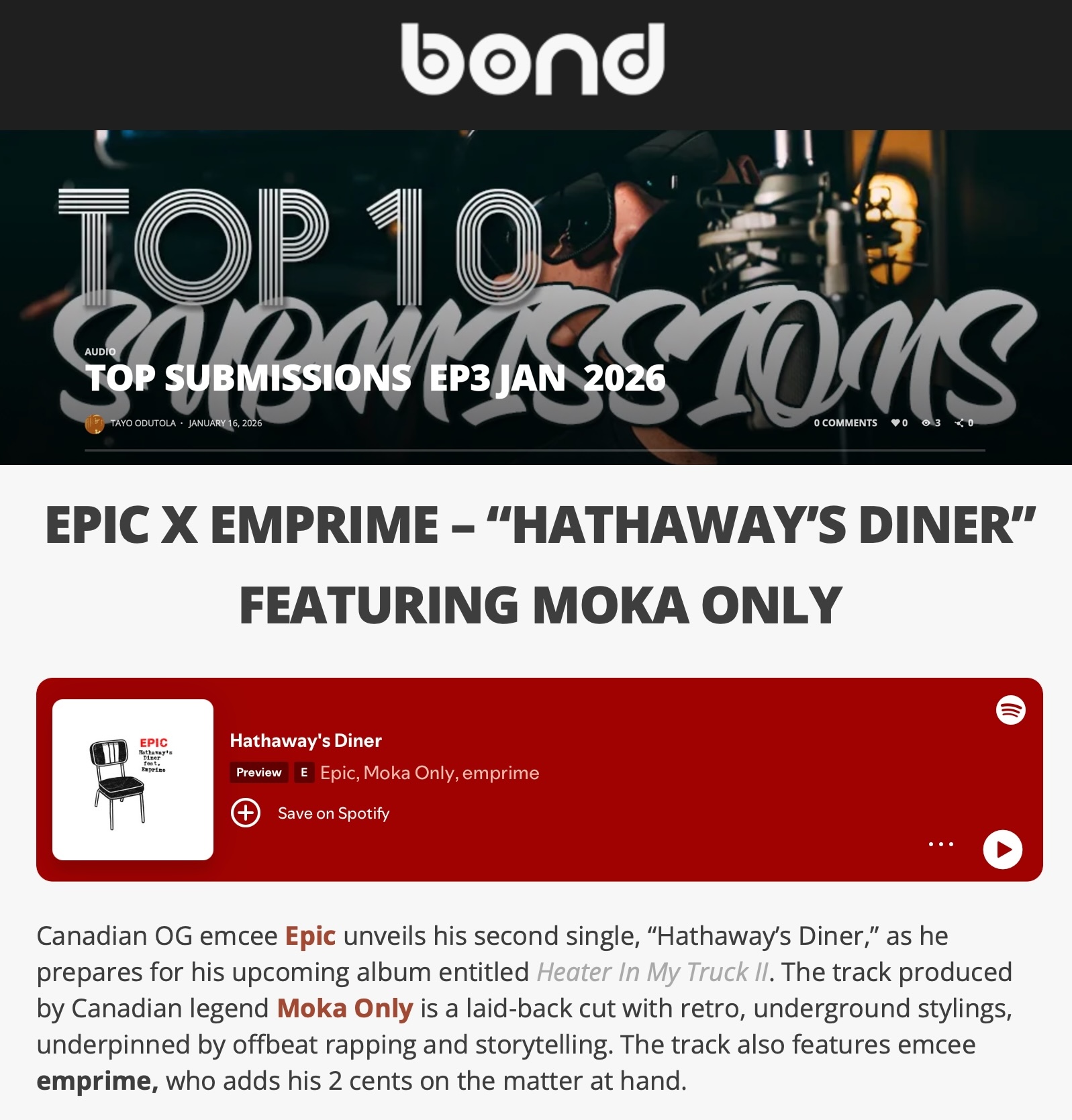 On this freestyle track that also serves as the second single to Heater In My Truck II, his upcoming new album dropping February 27, 2026 on Hand’Solo Records, Prairie rap legend Epic is joined by Emprime for this ode to local eatery Hathaway’s Diner over a spacey boom bap funk groove courtesy of Juno Award winner Moka Only. While the intro and chorus name drops the diner, Epic and Prime also touch on additional topics such as being an aging rapper, living in Canada, and there is even an homage to the Smoothe da Hustler classic “Broken Language”. “Hathaway’s Diner” is new school rap with old school ideals.