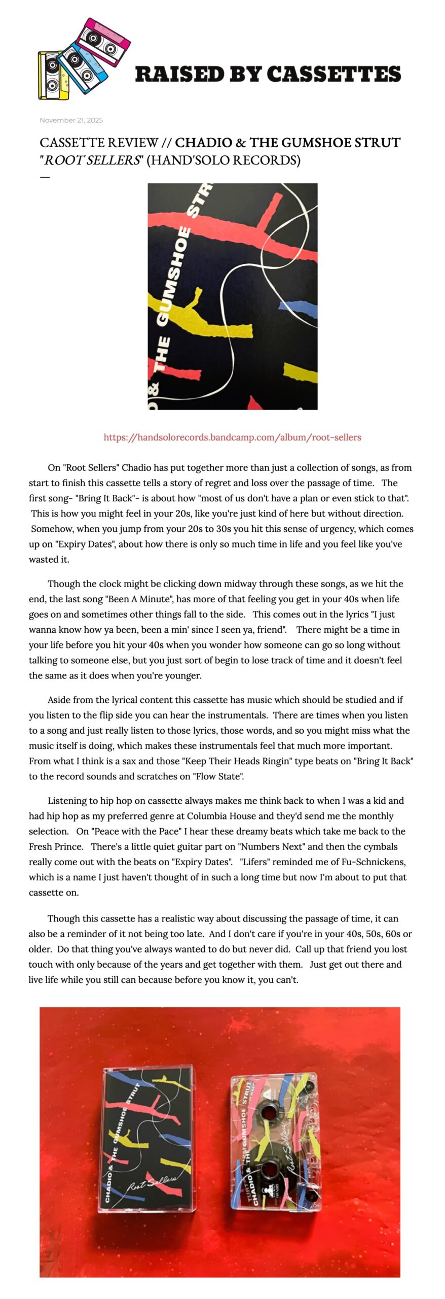 “On ‘Root Sellers’ Chadio has put together more than just a collection of songs, as from start to finish this cassette tells a story of regret and loss over the passage of time.” – Raised By Cassettes