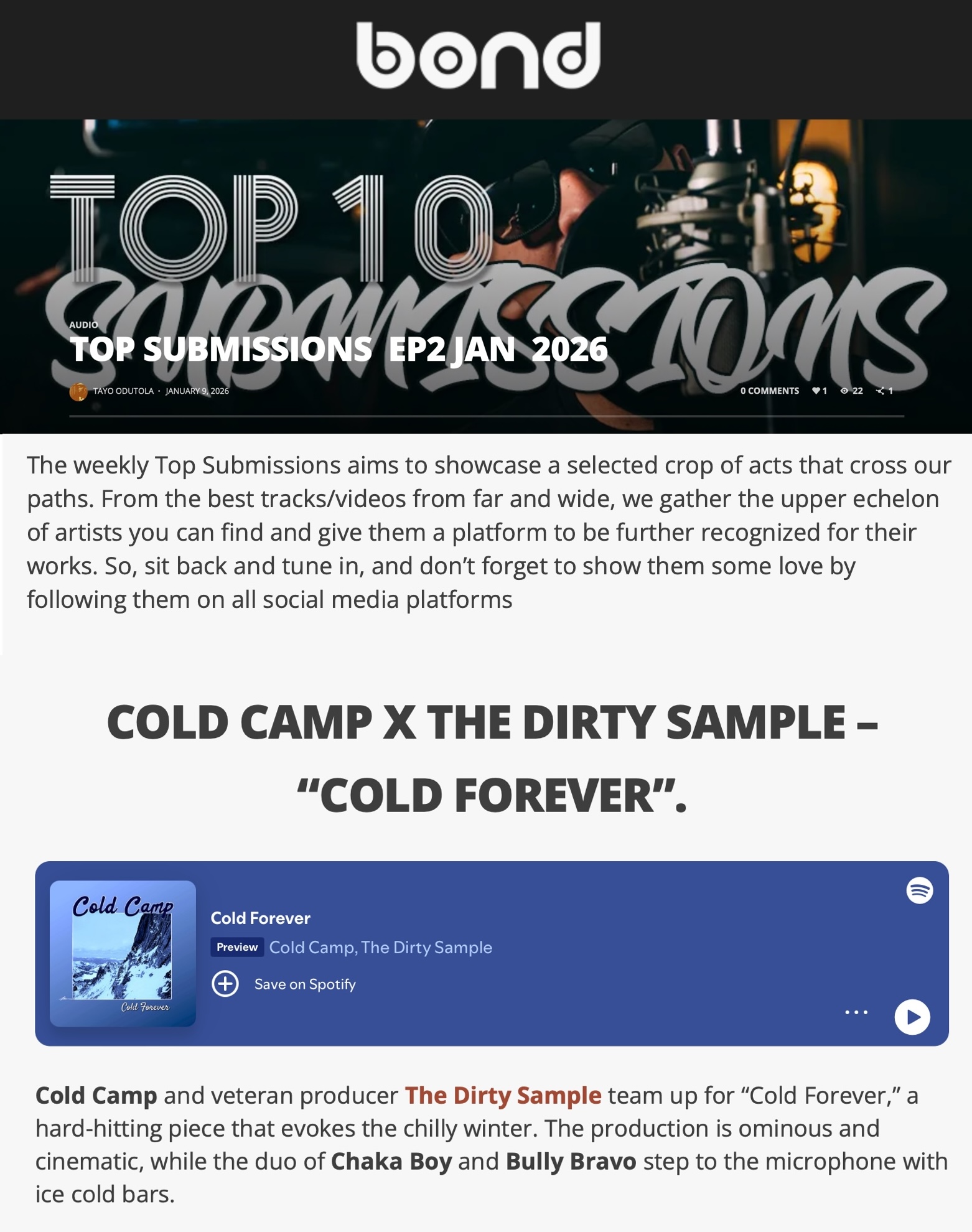 “Cold Forever” feels like stepping into a winter that never ends — a quiet, glassy world where every breath hangs heavy and every sound echoes off frozen brick. The Dirty Sample lays down a beat that moves with a slow, deliberate chill, giving the verses room to glide like black ice under streetlights. Chaka Boy and Bully Bravo carve through the track with sharp, precise imagery, stitching together cold truths with a calm steadiness that hits hard. There’s a sense of endurance woven through the whole thing, a reminder that some spirits are shaped by frost and strengthened by it. This song doesn’t just embrace the cold, it makes it feel like home.