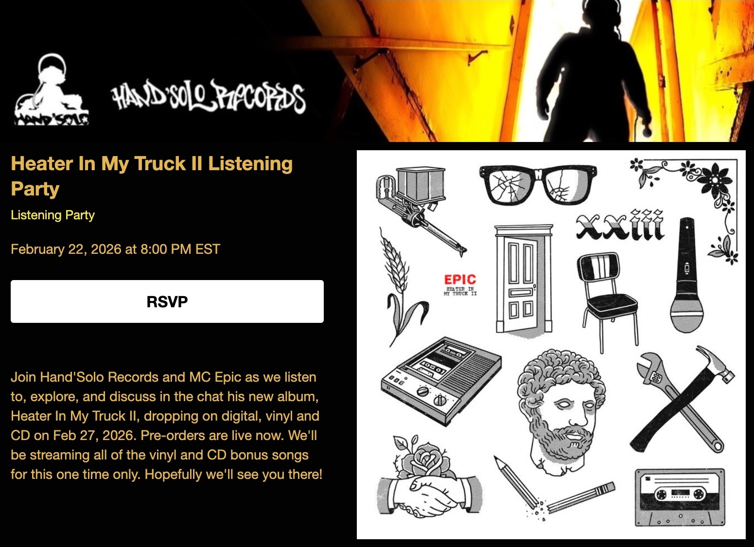 Join Hand’Solo Records and MC Epic as we listen to, explore, and discuss in the chat his new album, Heater In My Truck II, dropping on digital, vinyl and CD on Feb 27, 2026. Pre-orders are live now. We’ll be streaming all of the vinyl and CD bonus songs for this one time only. Hopefully we’ll see you there!