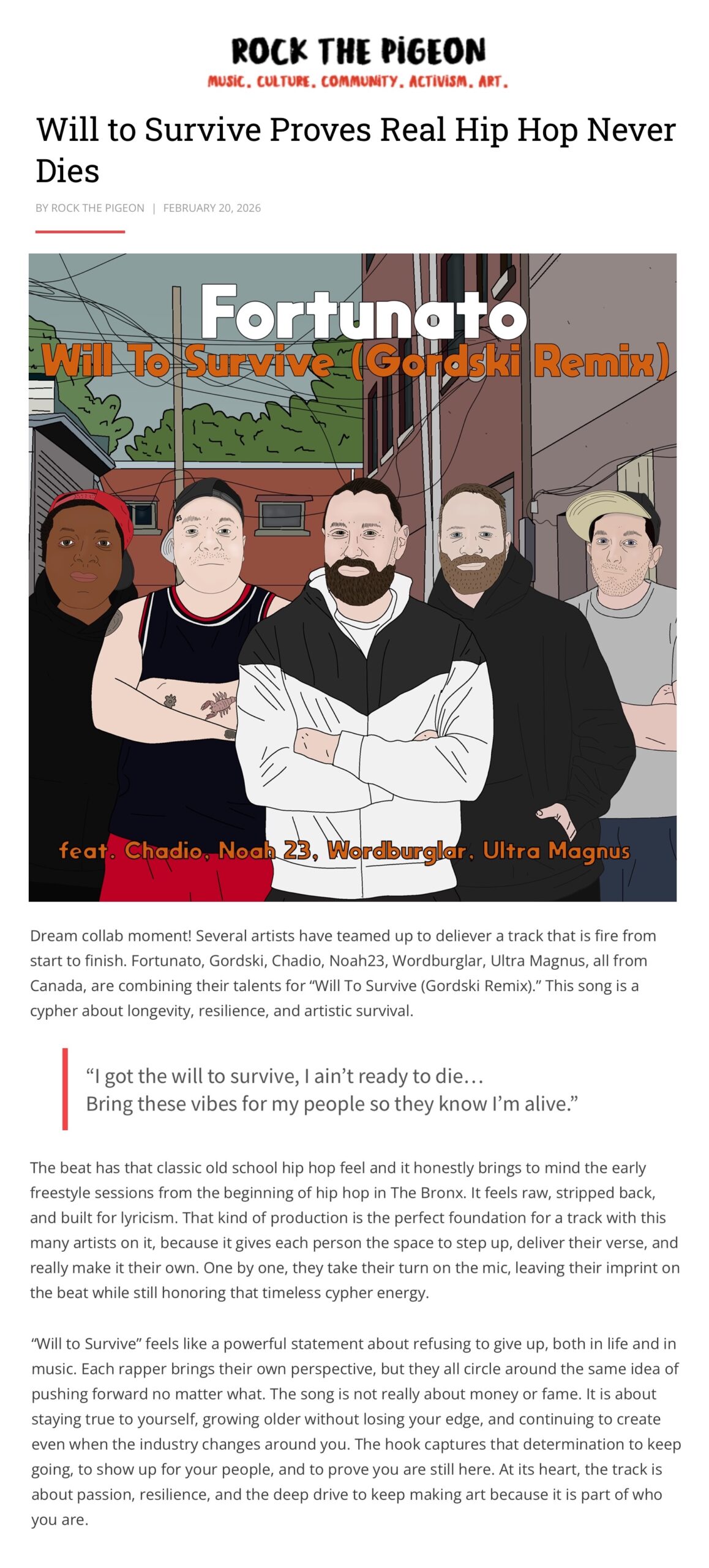 A great review has come through from Rock the Pigeon for Fortunato’s “Will To Survive (Gordski Remix)” featuring Chadio, Noah23, Wordburglar and Ultra Magnus.