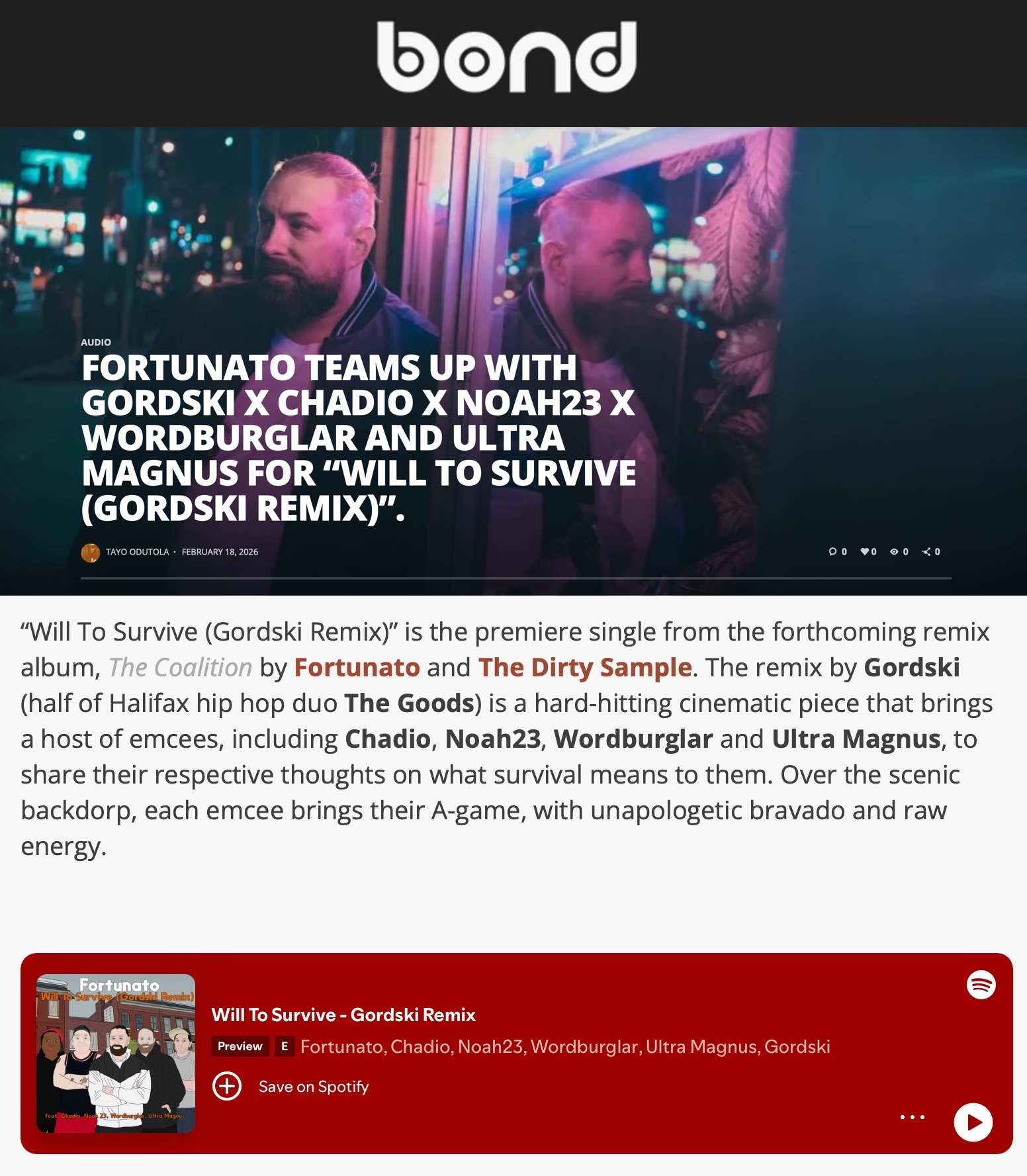 Word Is Bond drops a quick review of Fortunato’s “Will To Survive (Gordski Remix)” posse cut featuring Chadio, Noah23, Wordburglar and Ultra Magnus.